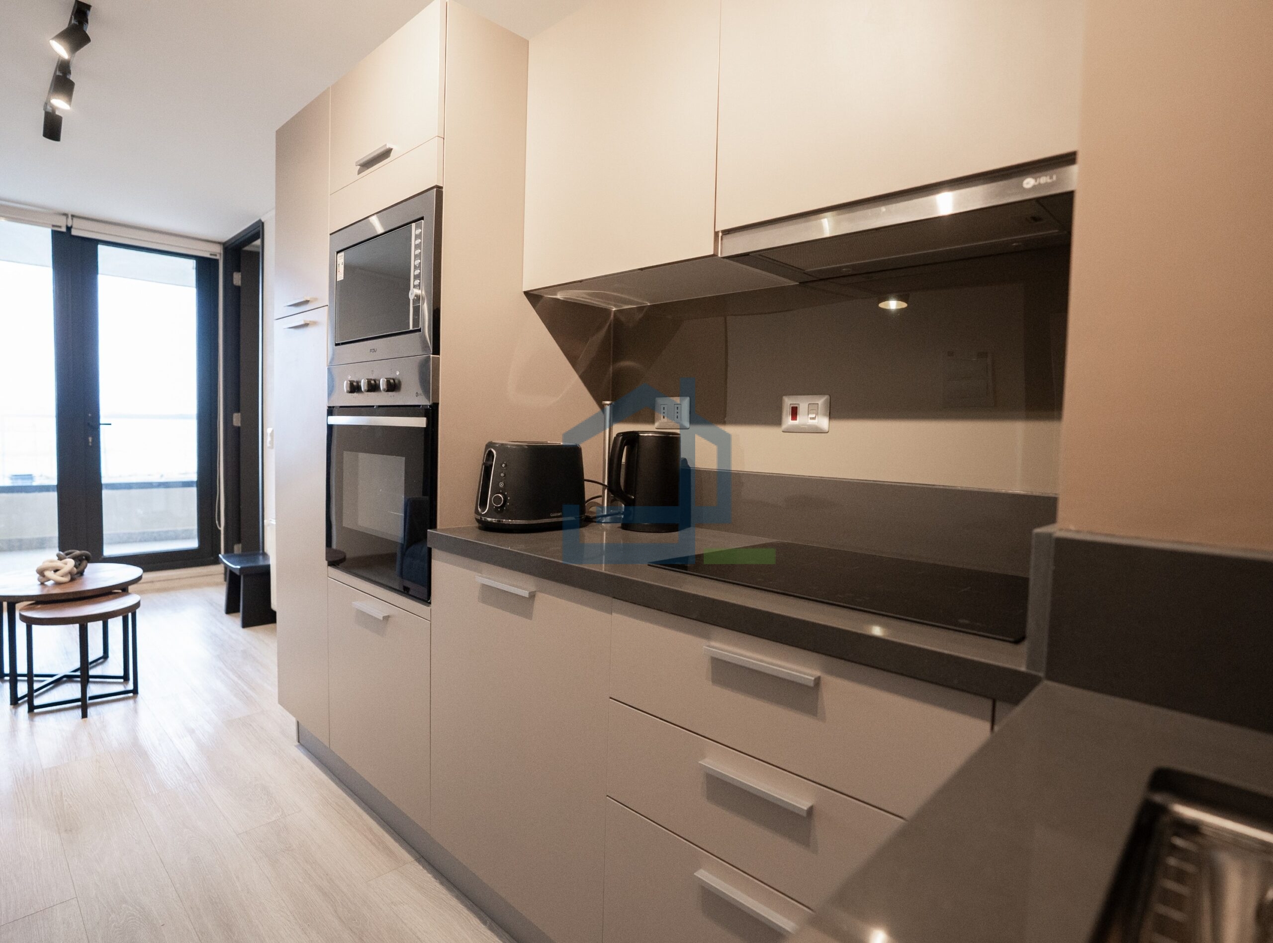 Horno, microondas y encimera eléctrica, refrigerador, hervidor, tostador, utensilios y loza completa.